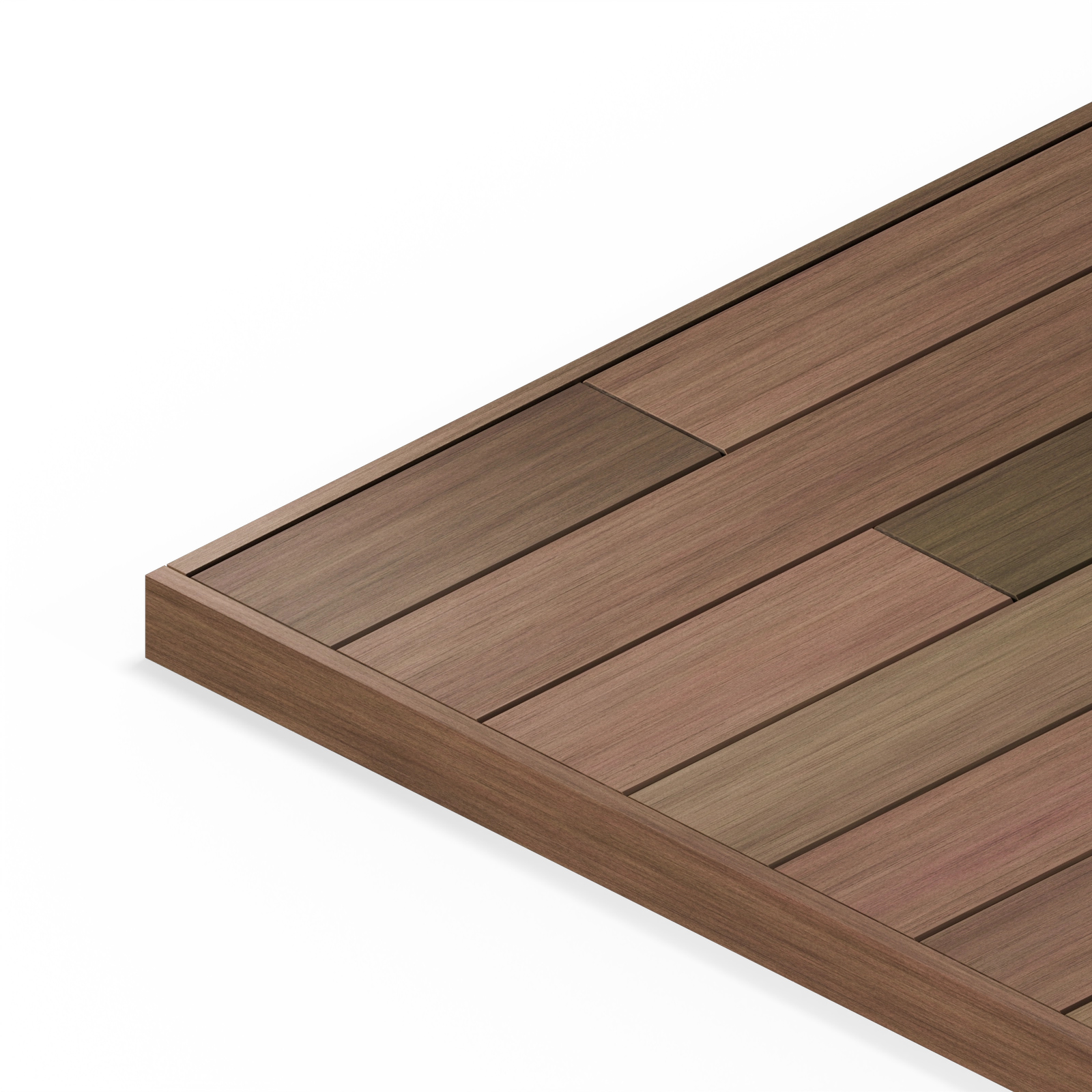 Le tavole da ponte in legno composito tropicale di Yhus imitano perfettamente le sfumature del legno esotico Ipé. Si fissano con le clip Yhus. La distanza massima tra i travetti è di 30 cm. Le tavole hanno un profilo solido coestruso (circondato da uno strato protettivo in polimero), adatto all'uso pedonale, in grado di sopportare un carico uniformemente distribuito di 250 kg/m².